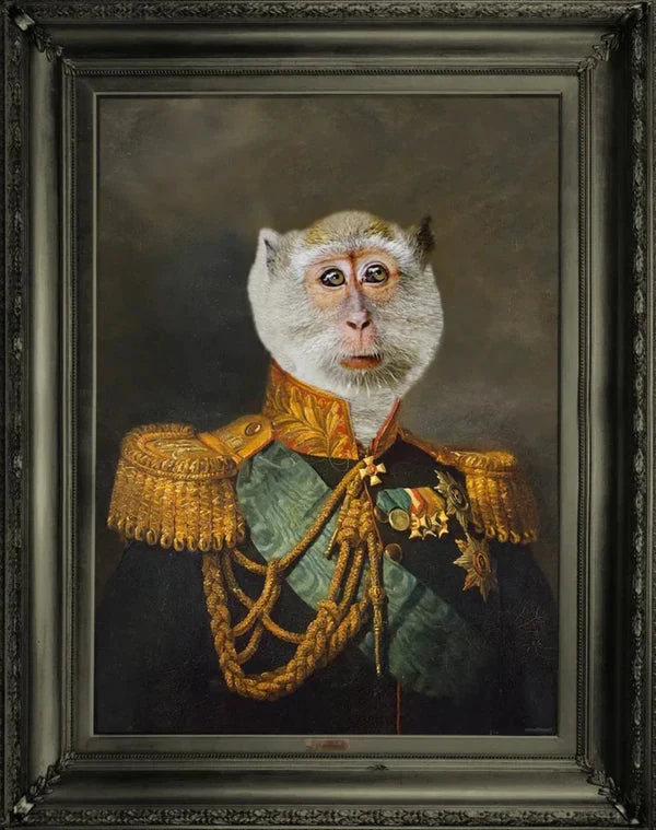 The 18th century aristocrats loved their pet monkeys and regularly dressed them up. In this modern day version designed by Angela Rossi, Duke Gibson is not just an animal art print – he looks commanding and perfectly at home in his regimental regalia complete with golden epaulets, dark green satin sash and medals for bravery. Let this art print of a monkey in clothes take pride of place above the mantlepiece for an eccentric addition to your home. The striking size options of this art design mean you can really make an impact on your wall – particularly dramatic in the large framed art print size!