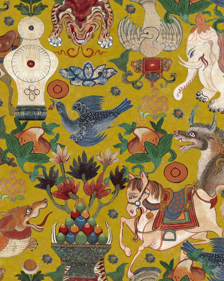 Expect the unexpected in the mystical world of INCANTATION. Where creatures roam freely through an enchanted setting, stay alert as you never know what lies around the corner. Exotic birdlife, ornamented horses and mythical dragon-like animals will surround you, as you wander through gardens filled with striking florae and intricate architectural figures. With backdrops of cream, dark blue and yellow, this vivacious print opens your senses as you imagine a rich, aromatic scent flowing through the air in this fascinating and captivating domain.