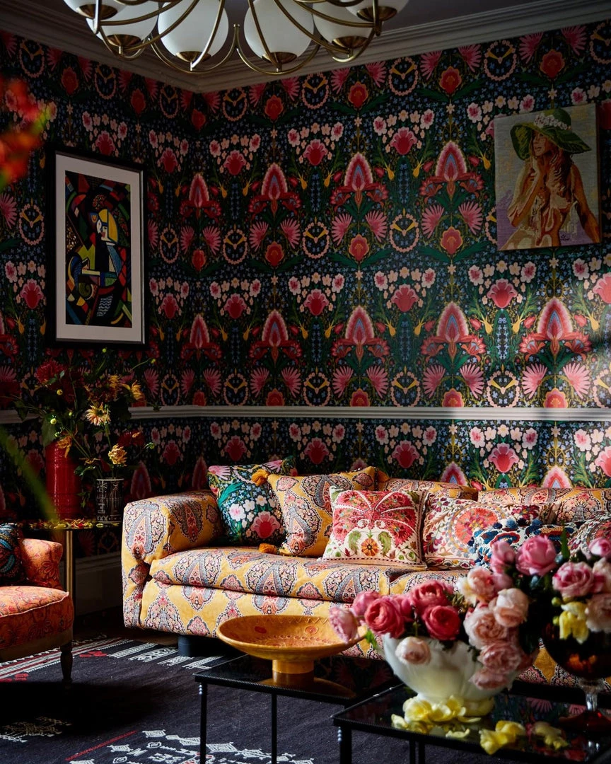 Listen to the lyrics of the Creedence Clearwater Revival classic as you find yourself amongst a mesmerising field of flowers, filling the air and vista with an assortment of vibrant scents and colours. Centred around a display of pink florals and a circular chain of blooms, the SUZIE Q print is filled with different varieties coming together to fill the walls with a colourful explosion, giving life to the room itself. Available with a light and dark background.