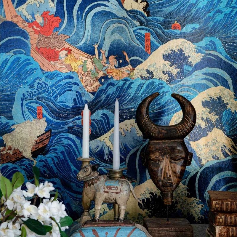 Ride ferocious waves with the most intrepid of sea farers – but make sure you hold on tight; a storm is brewing. Paying homage to Japanese woodblock prints of waves popular in the 1800s, THE FORMER EMPEROR tells the story of a ruler fleeing into the night followed by a flotilla of small wooden boats, all of which traverse a powerfully rough ocean guided only by glowing red paper lanterns. Designed in traditional woodblock print style, each wave, crest and swell are classically simplistic, with the frothy foam sharply picked out in bright white and the water becoming linear blue curves, with details highlighted in gleaming metallics.