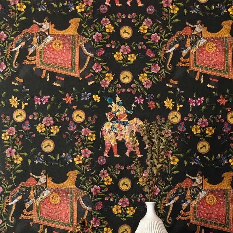 An amazing artwork on a black background, inspired by the traditional Indian fabric.