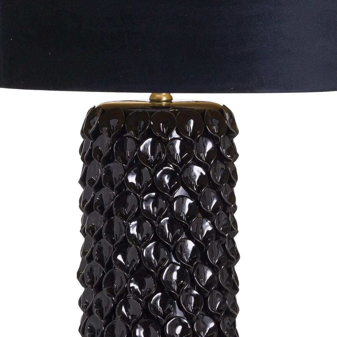 This is the Black Orchid Table Lamp With Black Velvet Shade. An impressively proportioned ceramic lamp with a glossy textured finish and brass bottom which will make a statement wherever it is placed. A striking piece, ideal for home interiors and hospitality venues alike.
