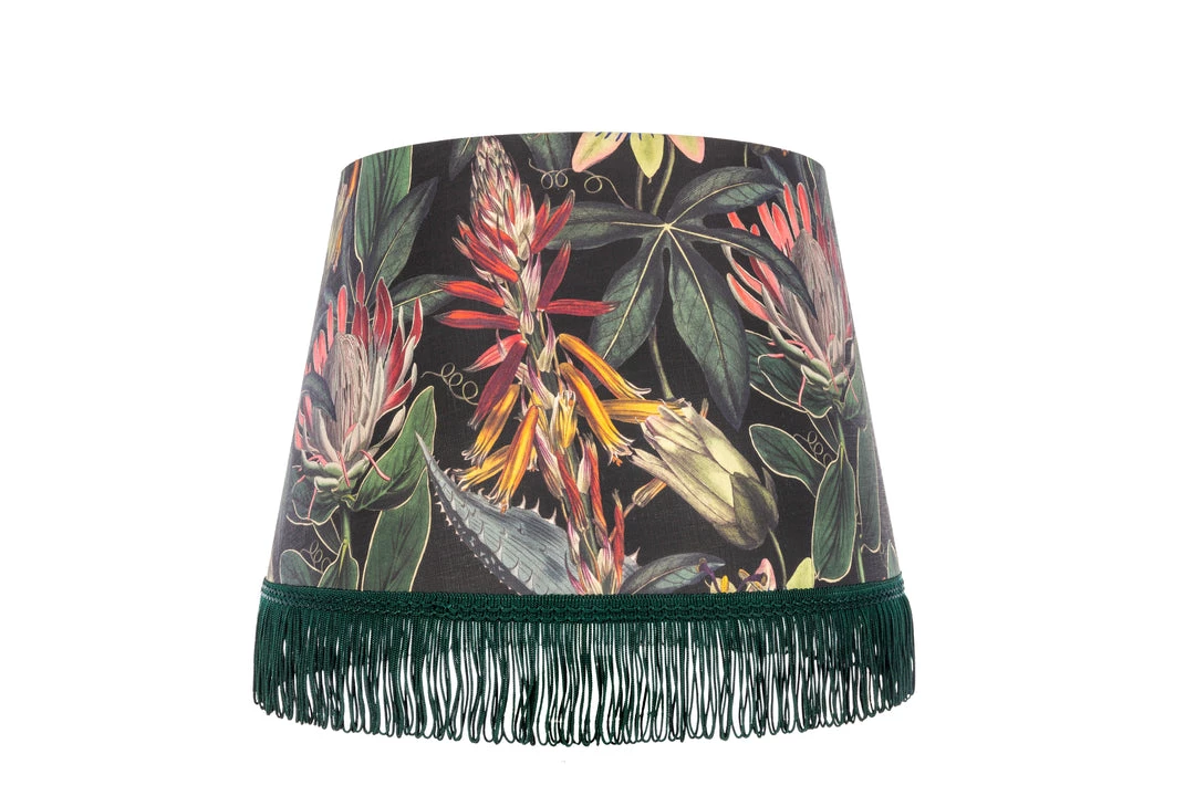 A rich flowery lampshade showing beautiful tropical flowers in full bloom. Printed on linen, finished with gold lining and green fringes.