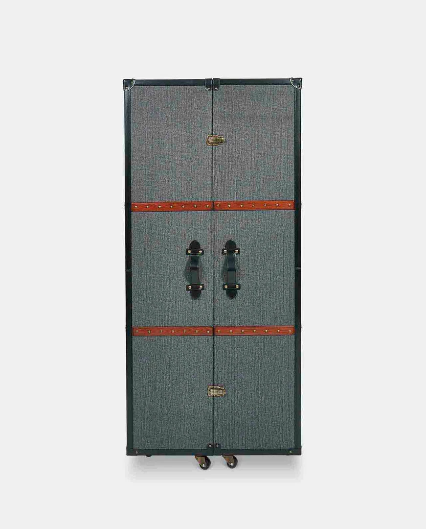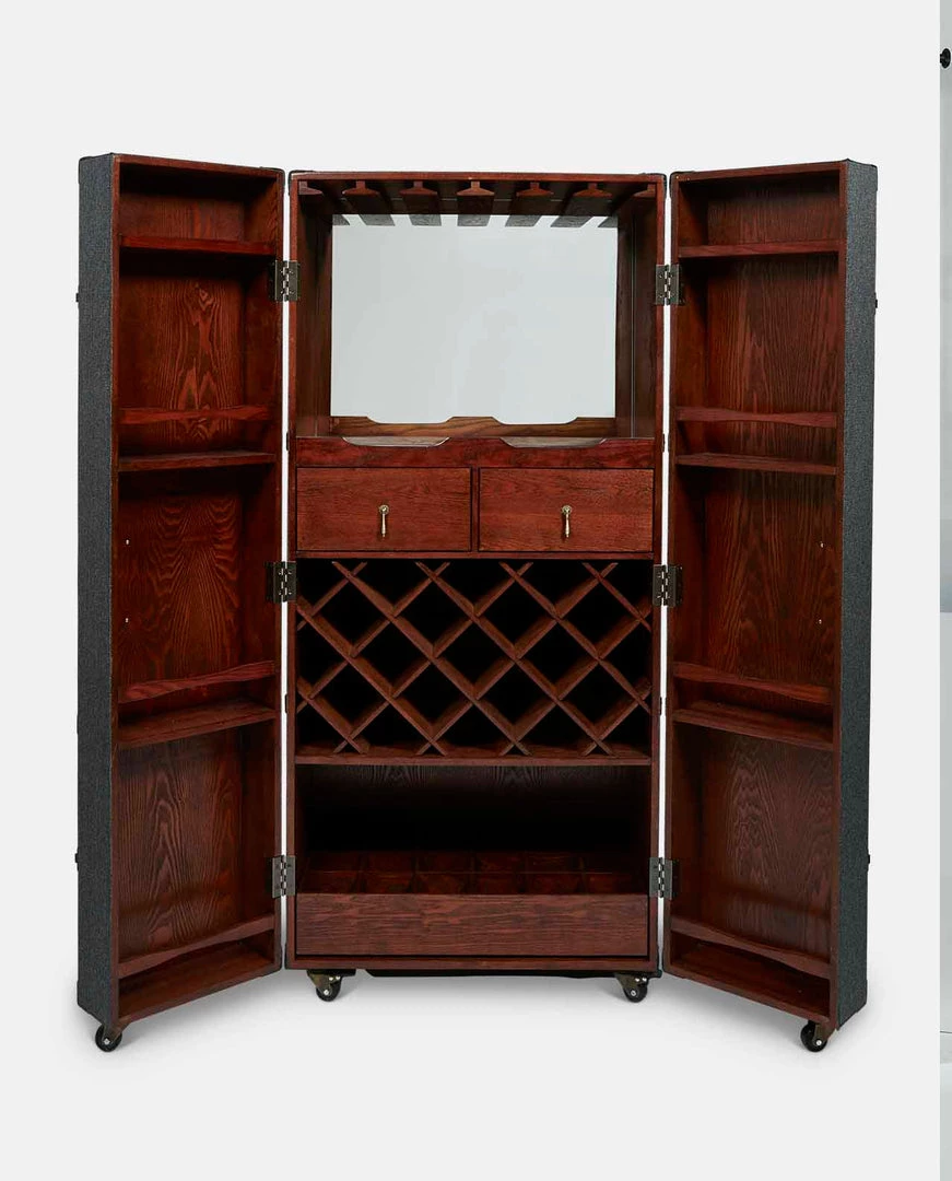 This unit, all hand made, has to be handled to be truly appreciated. A classic fine herringbone tweed covering over a solid wooden frame, all edged in leather. Upon opening from the front clasps, you are wowed by the quality of the interior. Beautiful rich stained solid wood with hanging spaces for your glassware (checkout out perfect accompaniement, our Italia smoked glass range), and two drawers, on a stylish sliding mechanism (love the details) with integral trays that can be extended.