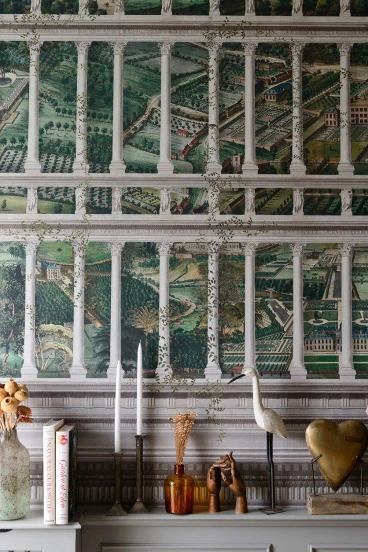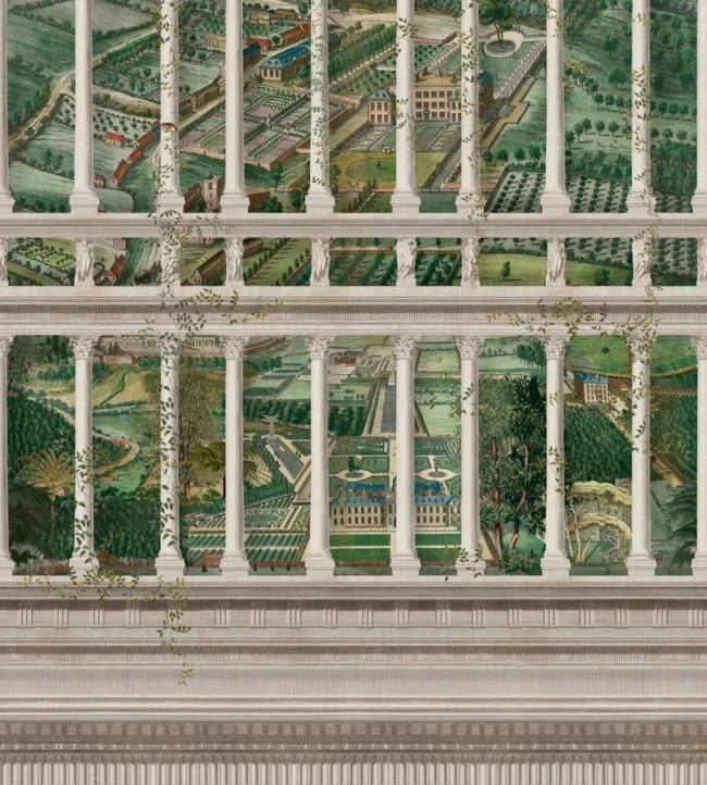 An impressive mural style wallpaper depicting an illustrated fairyland view with a large scale wall made with superposed architectural columns and in the background a stunning countryside scenery. A depiction of what we imagined to be the landscape around the Transylvanian Manor. The design is printed over 3 rolls.