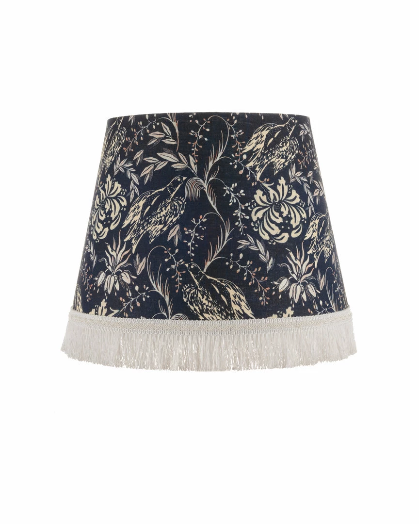 Noble blue of Hungarian roots blends together with elegant white floral stencil pattern in this stylish linen cone shade. Finished with white fringes and golden metallic lining.
