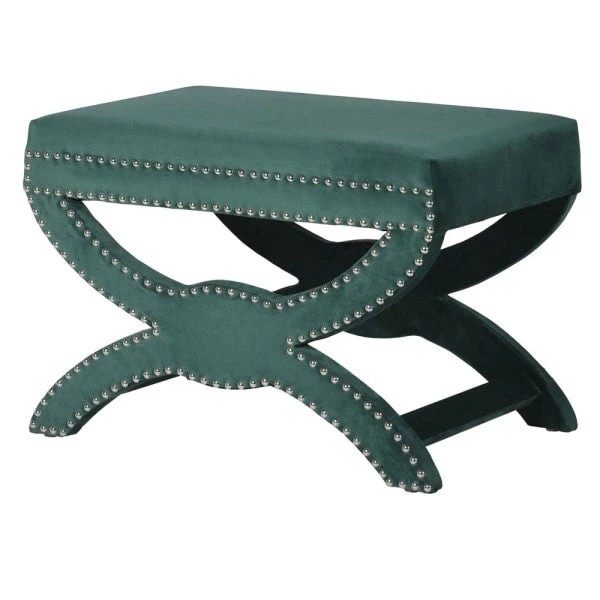 Opulent rich emerald green velvet footstool with silver studs in this classic X design.
