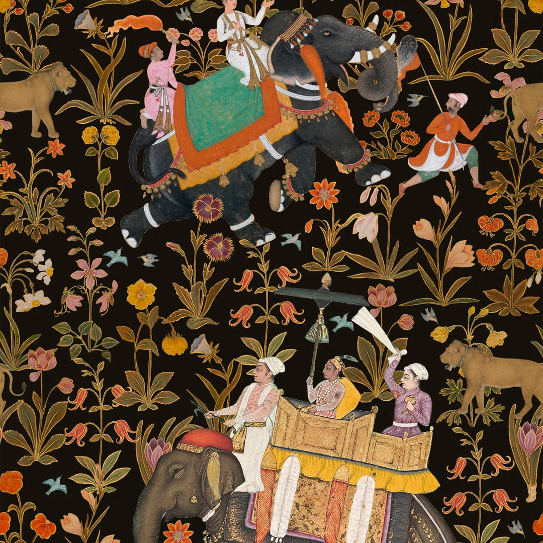Carefully tracing marvelous details of India, as described and perceived by Persians, the HINDUSTAN Anthracite Wallpaper is true work of art displayed on a dark and intense background. Emblematic and fascinating, the sacred elephants of Hindu are beautifully complimented by minutious flower stems and leaves, in an intricate and suave wallcovering design. Make a statement wall in your own living room or decorate an entire room and invite true, mystical vibes into your home. Also available in a more neutral or lighter mood, against a light green or pale blue background.