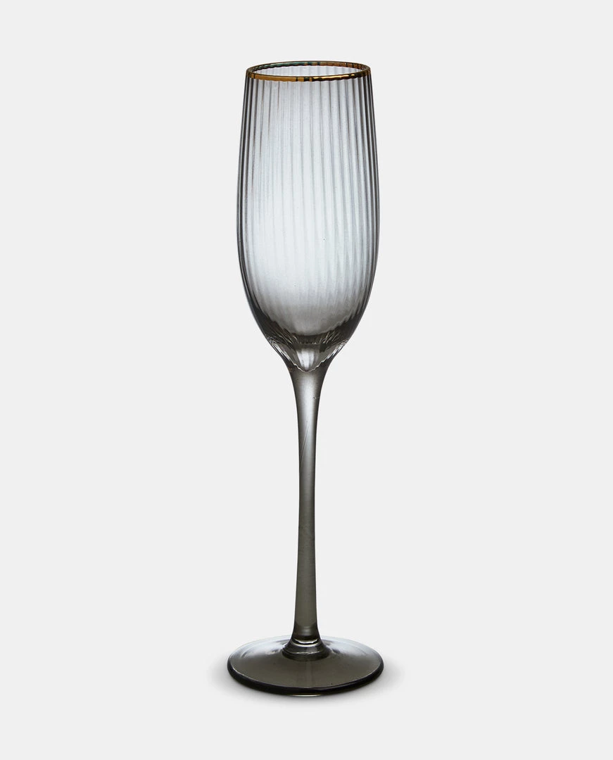 A beautiful addition to our smoked Italia glass range, this is super elegant and timeless. Smoked ridged glass flute with gold rim.
