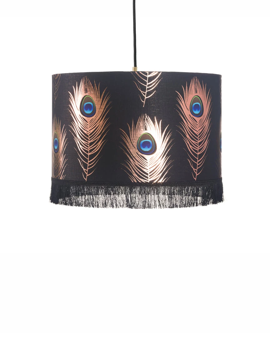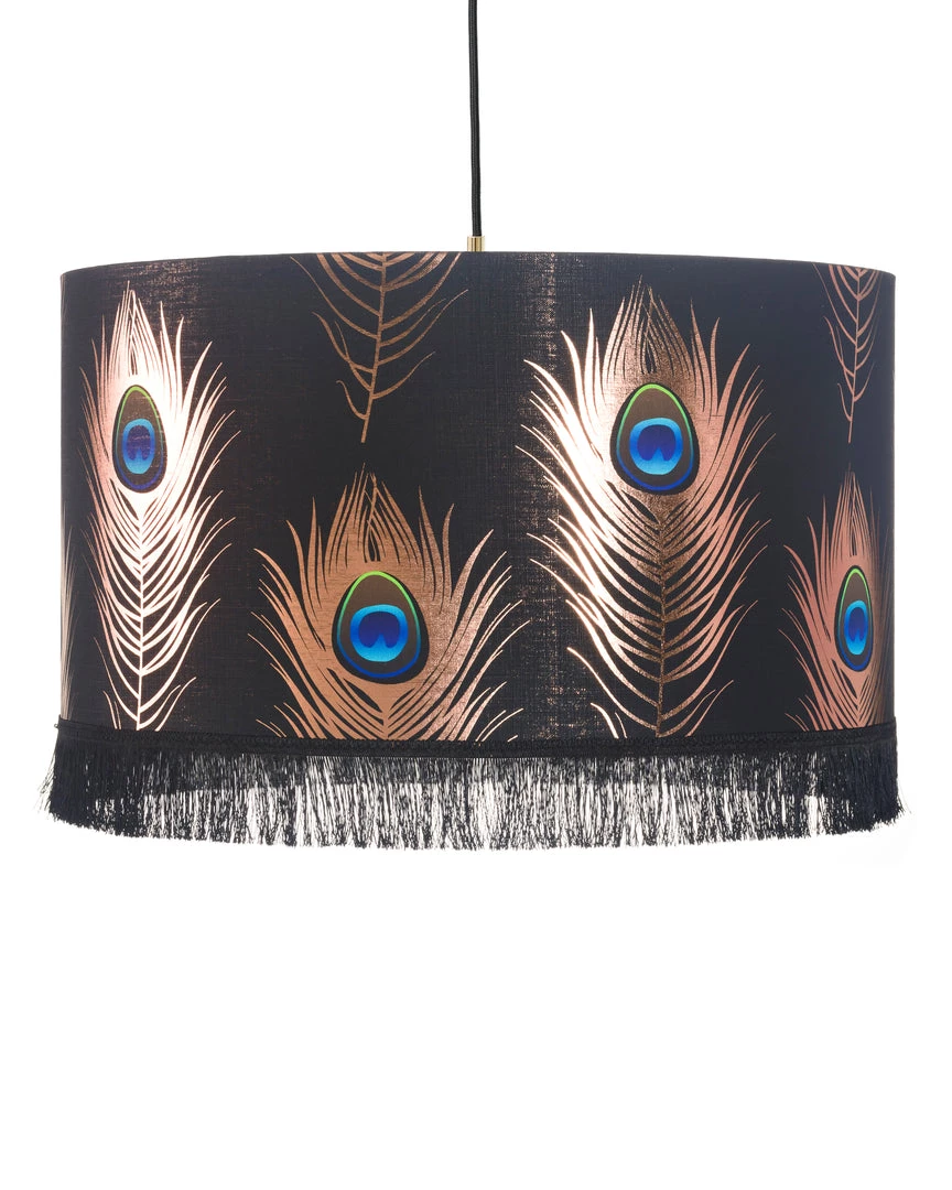 The luxurious PEACOCK FEATHERS lampshade design features gorgeous details of elegant plumes, in vivid blues and copper shades. Against a black background, the design is printed on linen, while the lampshade is finished with copper lining and assorted black long fringes. It comes with copper metallic ceiling rose, E27 lamp holder and black braided fabric cord.
