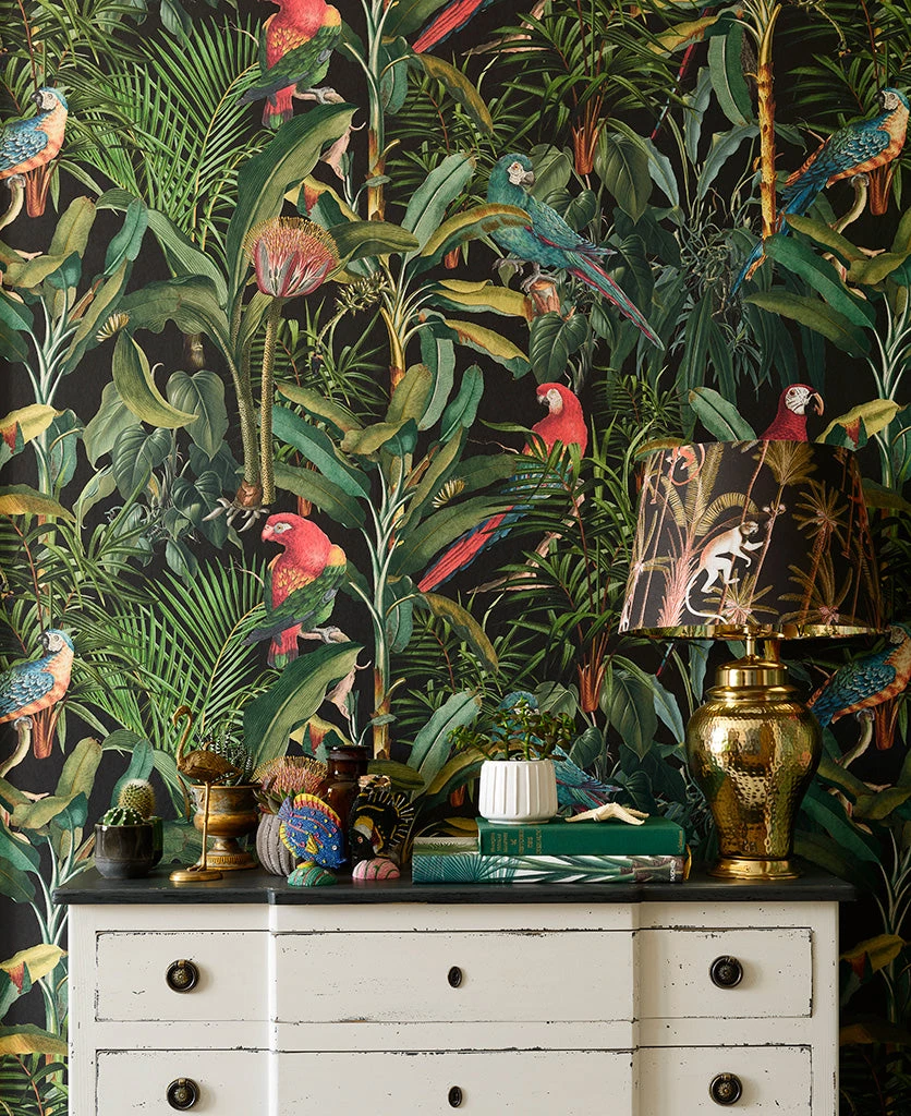 In this vibrant wallpaper design, inspired by the beautiful flora and fauna of Brasil, there is a stylish mix of beautifully illustrated parrots and tropical plants, in an effort to recreate the paradisiac feel of a lush exotic habitat. Each parrot, elegantly highlighted with bright strokes of color, adds to the complexity of the exquisite wallpaper. From the scarlet macaw, to various parakeet species, the layout is full of lively symbols of the evergreen forests of Brasil, emphasizing the rich ecological diversity of the region.
