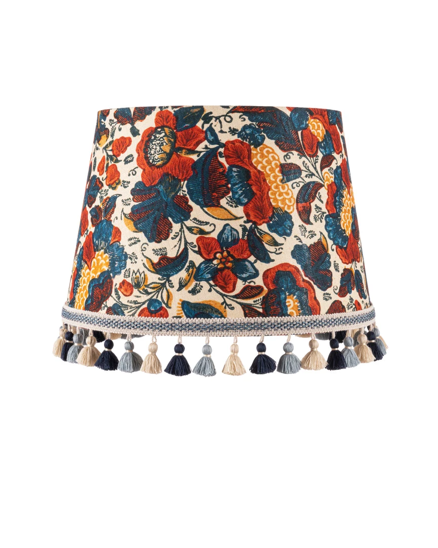 This colourful floral print captures the essence of ‘flower power’ in the late 1960s, with the complementing blue and orange tones harmonising to bring the pattern together. The fabric cone lampshade is finished with blue and white tassels and metallic gold lining.