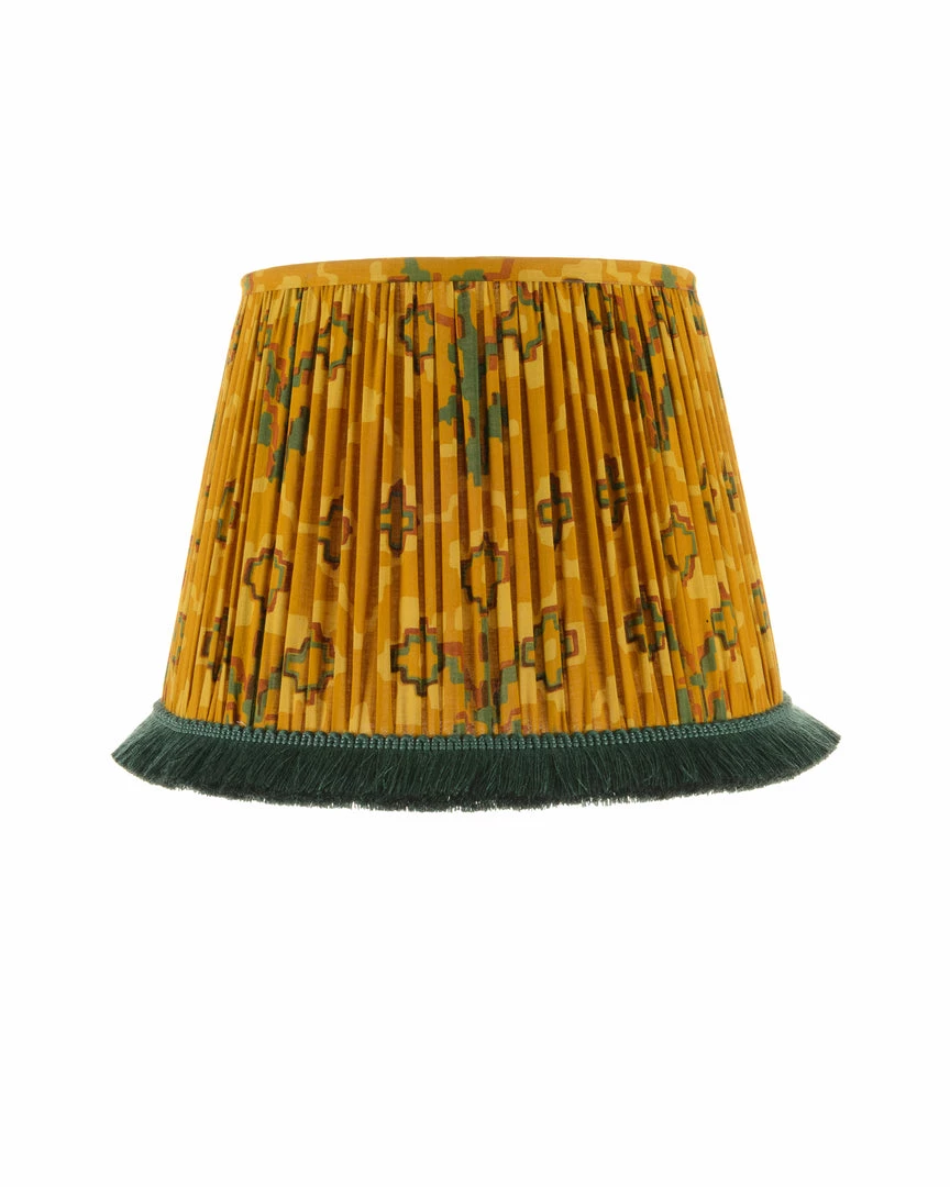 Light up the mood with the golden glow of this round soft pleated lampshade. Hand-finished with green fringes, reversible gimbal fitting and white fabric lining.