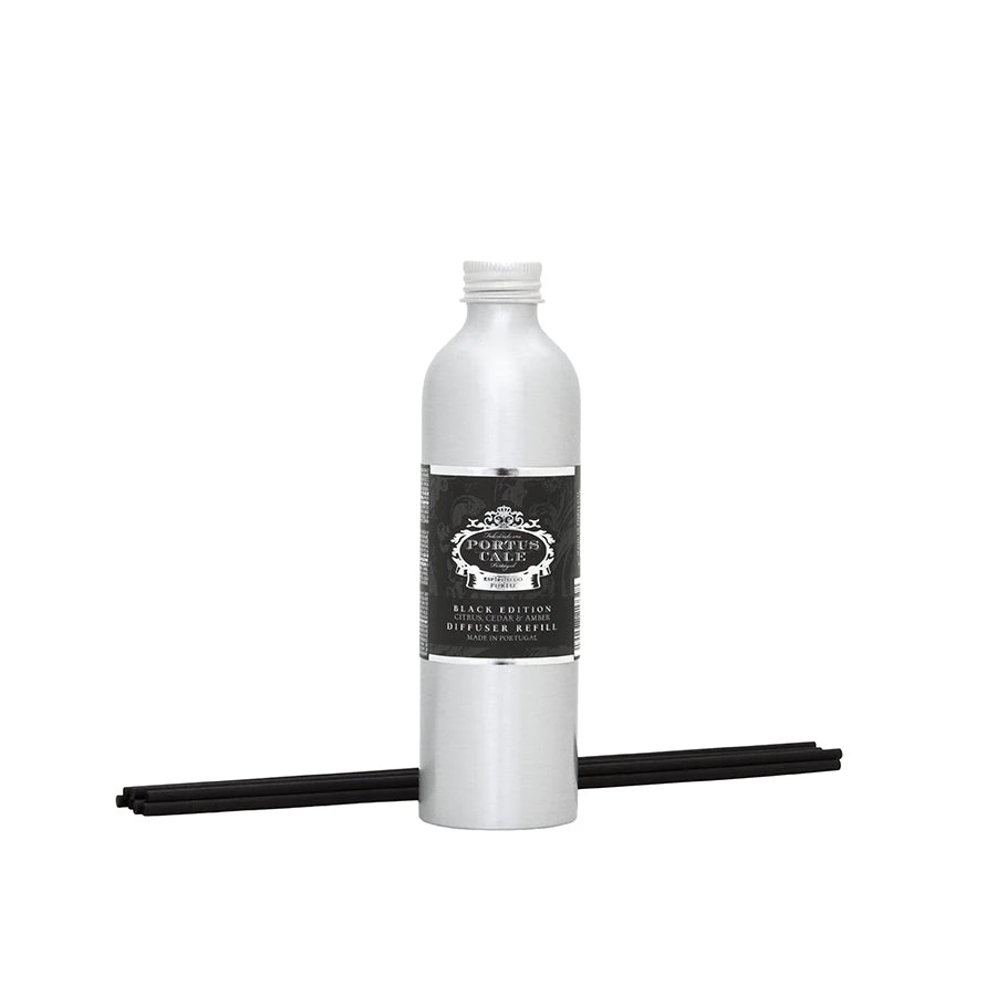 Citrus underlined by warm wood notes – such is the sophisticated scent of Black Edition. The Portus Cale Black Edition 250mL Fragrance Refill allows you to fill your favourite space with this refined fragrance. Can be used on all your Castelbel and Portus Cale Refills. Its oil-based perfume is alcohol-free and is scented with essential oils; this allows for a long-lasting and pleasant aroma. Black coloured reeds included.