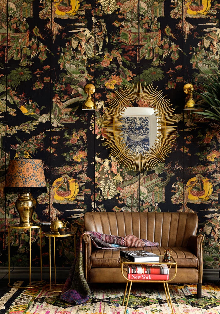 Intriguing and sophisticated, this Asian style wallpaper is inspired by ancient Chinese and Japanese folding panels. With large scale hand coloured illustrations, the wallpaper is depicting different rituals and scenes collected from ancient Japanese books. A truly masterpiece wallpaper created on 3 meter rolls. The design is printed over 3 rolls.