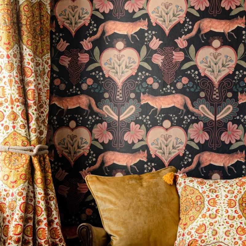 Depicting witty details of Carpathian wildlife, THE VIXEN is emblematic for our ancestors’ hunting habits as well as for traditional mirrored patterns. Bold and charming, the red fox stands out in a soothing flowery decor. Available on anthracite or taupe background.