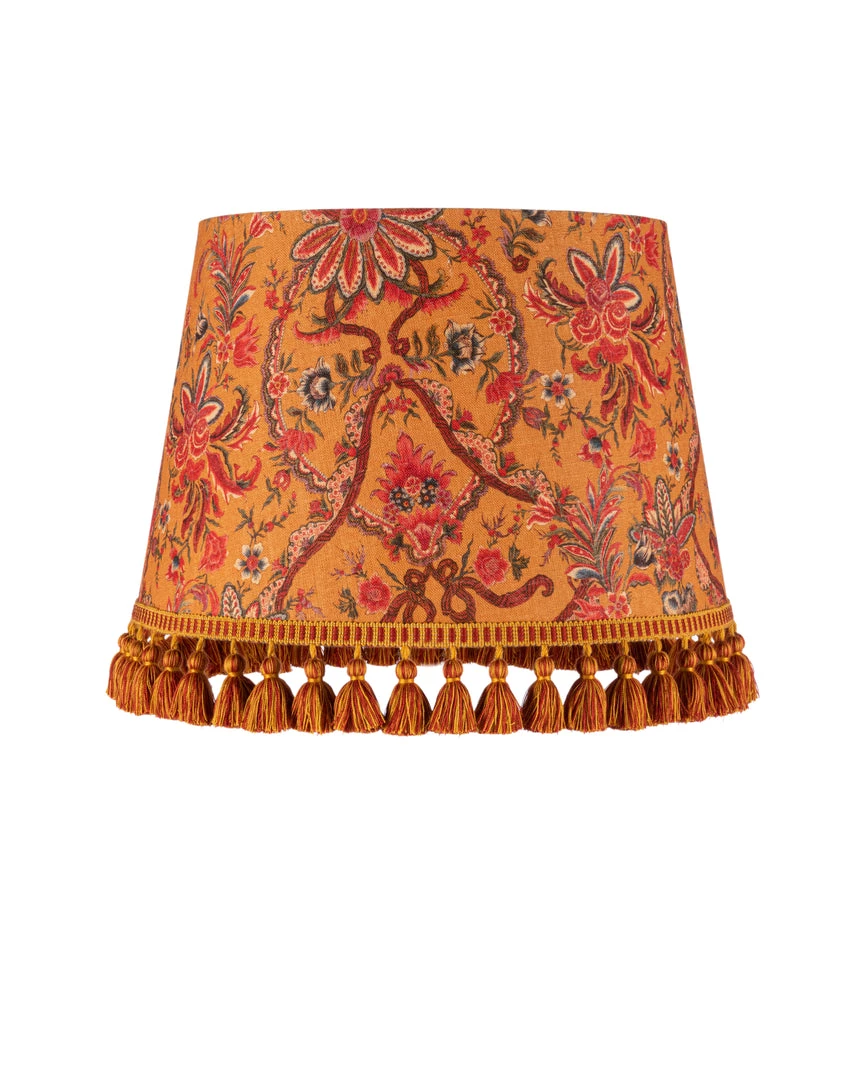 Encapsulating the ambience of the festival entirely, this alluring design creates a show-stopping statement with its swirling floral forms and opulent colour palette. The fabric cone lampshade is finished with orange tassels and metallic gold lining.