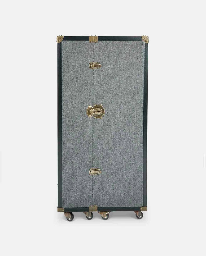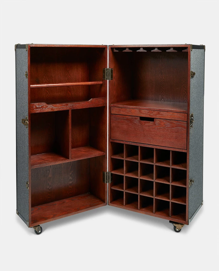 A smaller version of our beautiful hand made solid wooden trunk style bar/wine cabinet. This has a wonderful feel to it and has a beautiful fabric covering and leather trim