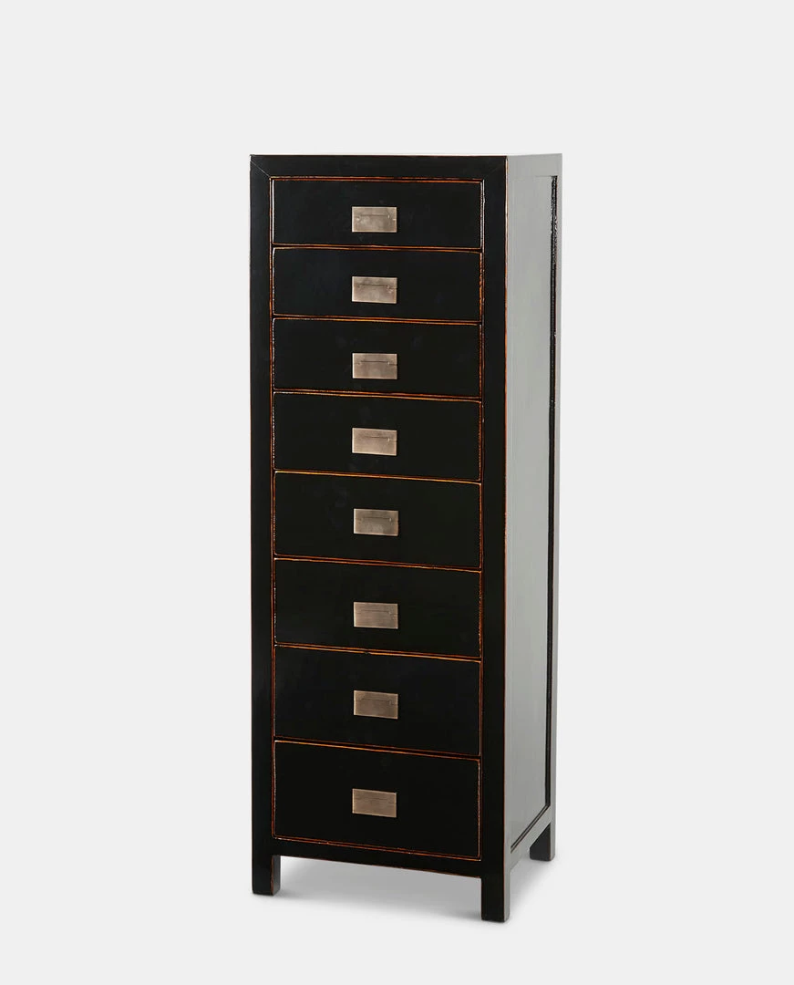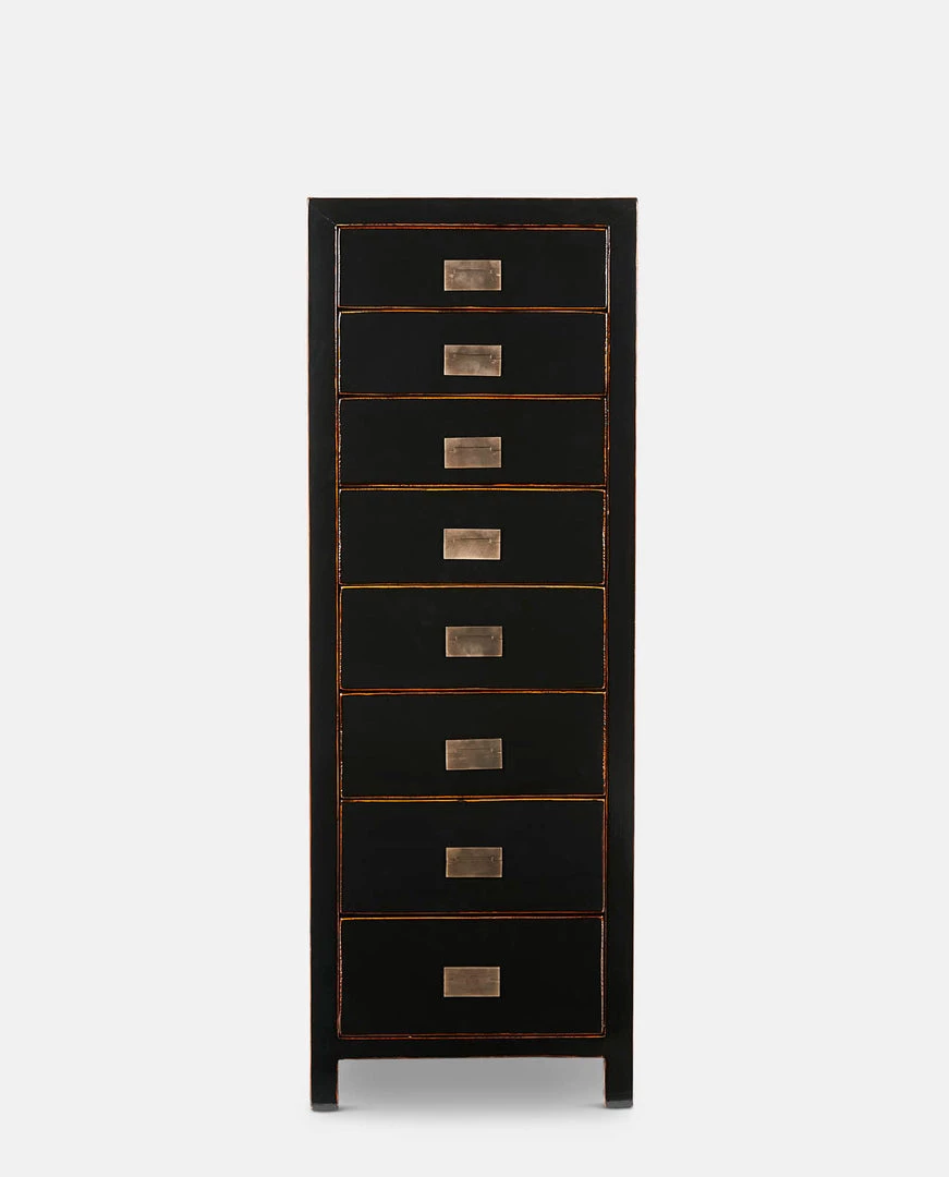 Tsang Black lacquered Tallboy with 8 Drawers finished with Brass handle detail.